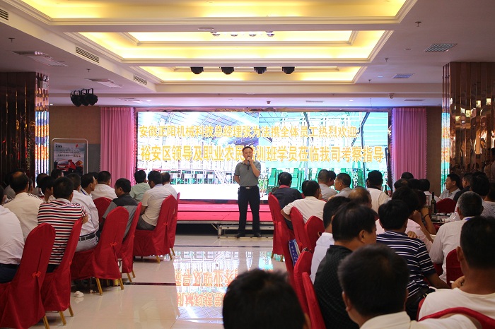 9月13日下午,裕安區(qū)職業(yè)農(nóng)民培訓(xùn)班一行人蒞臨我公司考察指導(dǎo),此次培訓(xùn)班由200多名種植大戶組成,場面十分熱鬧,公司張為法總經(jīng)理、許為青副總經(jīng)理、總經(jīng)理助理胡家冀、銷售部部長張杰等參與了此次接待活動,張為法總經(jīng)理代表安徽正陽機(jī)械科技有限公司表達(dá)了對于他們此次來訪的熱烈歡迎。
